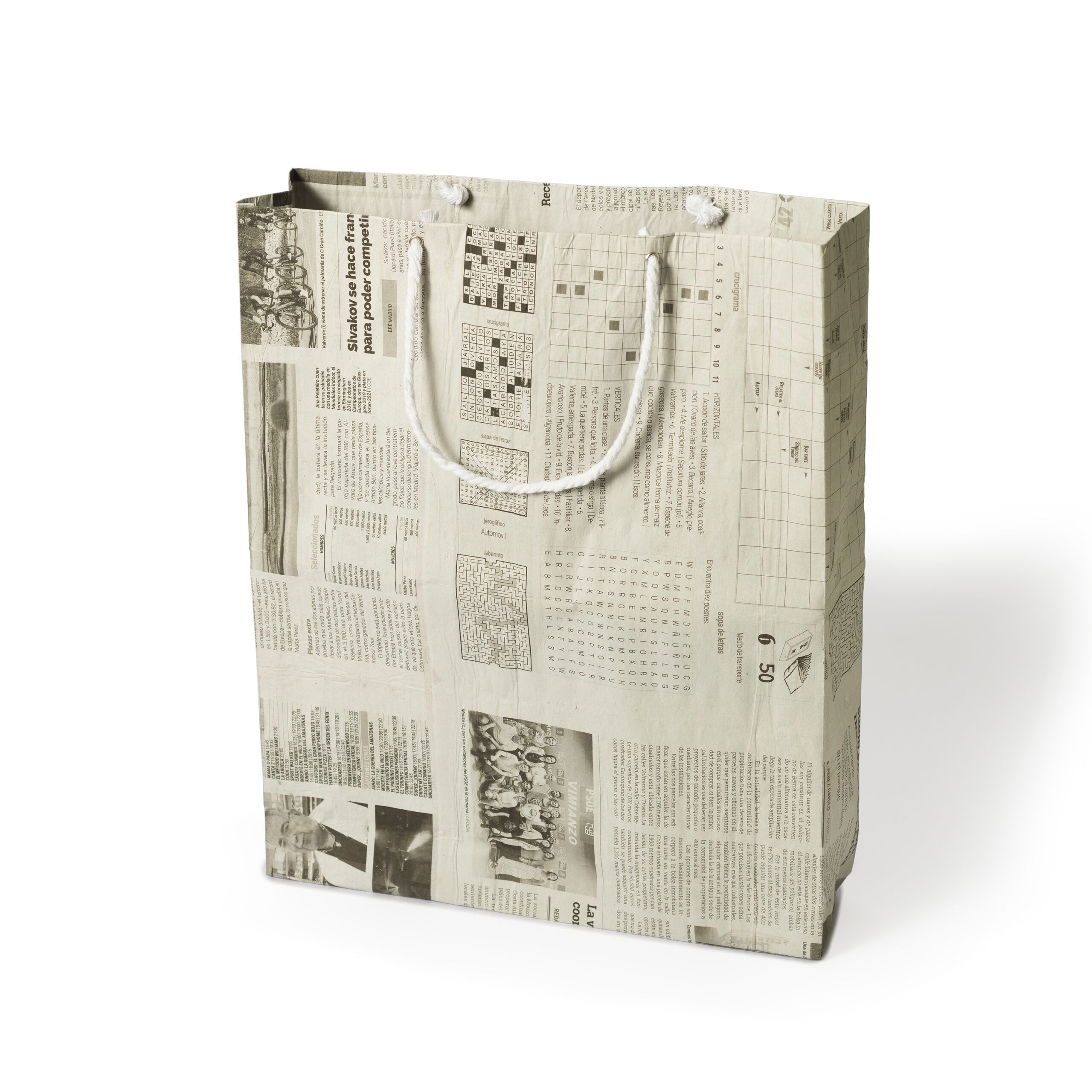 Bolsas de papel con medidas 29cm x 20cm x 7,5cm de para empaquetado elaboradas con papel de periódico reciclado, ideales para un packing ecológico y responsable.