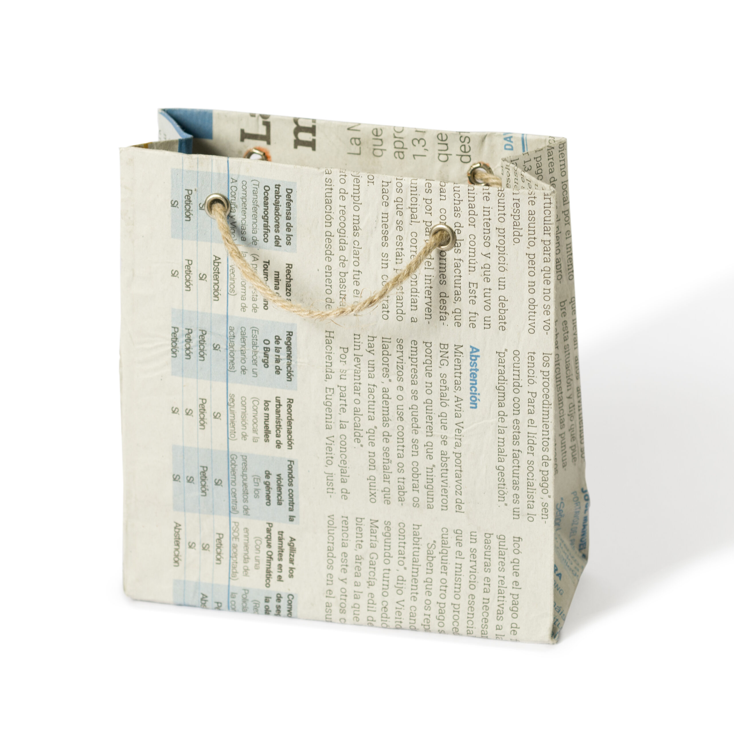 Bolsas de papel pequeña de 9cm x 12 x 3,5cm para empaquetado elaboradas con papel de periódico reciclado, ideales para un packing ecológico y responsable.